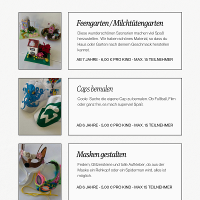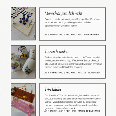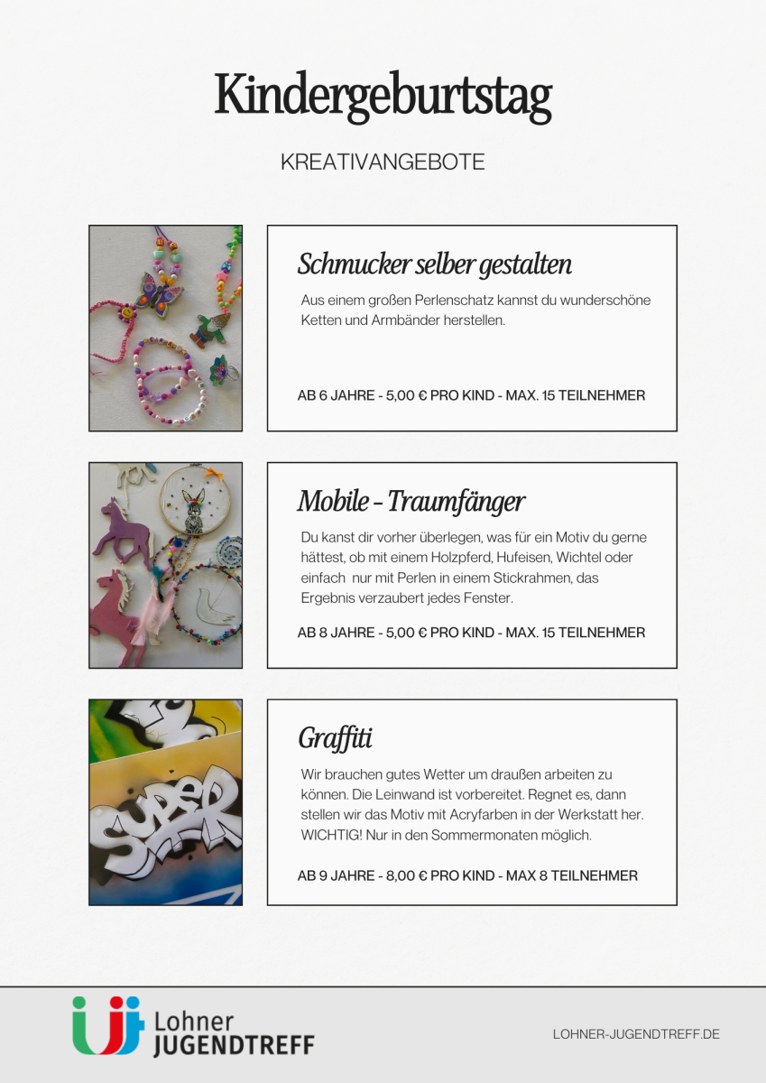 Speziell für die Feier eines Kindergeburtstages halten wir ein umfangreiches Angebot bereit. Es erstreckt sich von der Nutzung unserer Räumlichkeiten bis hin zu Bastel- und Kreativangeboten für alle Gäste und natürlich das Geburtstagskind. Diese Angebote (Bastel- und Kreativangebote) werden von einem Mitarbeiter des Jugendtreffs begleitet und durchgeführt. Einzige Bedingung: Mindestens eine volljährige Betreuungsperson (Mama, Papa, erwachsene Geschwister…) muss während der Geburtstagsfeier anwesend sein.